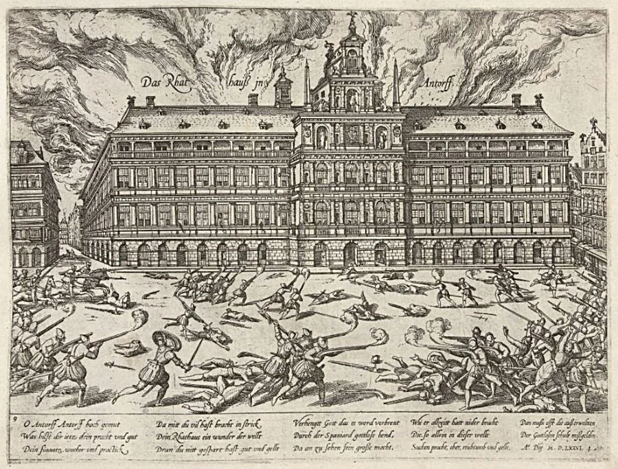 With the sudden death of governor Luis de Requesens in March 1576, a power vacuum had arisen in the Netherlands because Juan de Austria, the man who was going to succeed him, had only arrived in November of the same year. As a result of the several mutinies in the Spanish army, the Council of State, which had taken over the political administration, kept on demanding the departure of the Spanish troops. This had led to tensions with the military authority and when the States of Brabant had lifted their own troops, the royalists considered it a form of rebellion. When those soldiers (Germans, Walloons and Brabantians) were sent to Antwerp, where the Spanish royal garrison was stationed, a violent clash became inevitable (2).