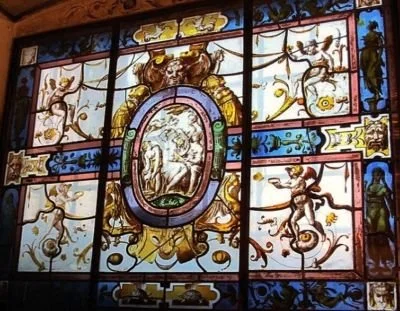 In 1558, Hendrik van den Broeck was also the creator of the lost glass windows in the choir and sacristy of San Lorenzo and he was also responsible for the ones in the Biblioteca Laurenziana. The cartons were most likely drawn by Giorgio Vasari or one of his collaborators (Marco Faenza or Giovanni Stradano) and executed by the stained-glass artists Gualtieri d'Anversa and Arrigo Fiammingo between 1558 and 1568. The painted windows let in a reasonable amount of light (it was a reading room after all) and spread a warm and diffuse light. There are no major scenes or specific exploits of the Medici here, but only references to the patrons such as emblems, coats of arms and sayings. Between the grotesques, the putti and the garlands appear the palle (the balls) of the Medici, the ibex and the golden fleece (referring to Cosimo I), the crowns and tiaras (referring to the popes), the 3 plumes with the ring and the motto Semper (referring to Lorenzo il Magnifico) (see fig.3)