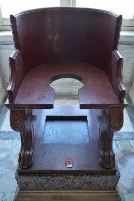 In earlier times it was a tradition that at his inauguration the pope had to sit on 3 chairs which symbolized his accession to the throne on the chair of Peter, his worldly position of power but also his humility. One of those chairs stood in the portico of the Basilica of St. John Lateran and was called the sedia stercoraria , which was later translated as "dung chair" or "poop chair". During the ritual, a psalm verse was spoken: "Deus exaltavit humiles et de stercore erexit pauperem" ("God elevates the humble and lifts the poor up out of the dirt") from which the name of the chair is derived (see fig.1). The chair was made of marble and was also called the sedia marmorea . The 2 other porphyry chairs (sedie porphyreticae) stood in the church of Saint Silvester and had a notch in the middle, which was supposed to allow the pope to adopt a lying position (1), but which, according to tradition, made it possible to use the chair as a toilet showing that the pontifex was only human (see fig.2).